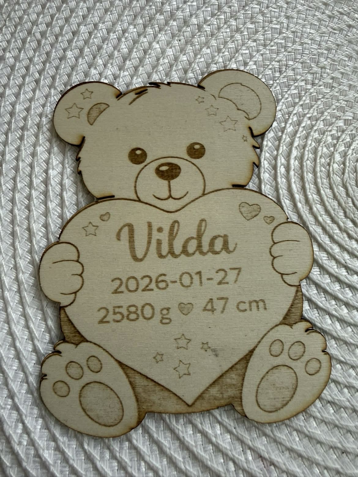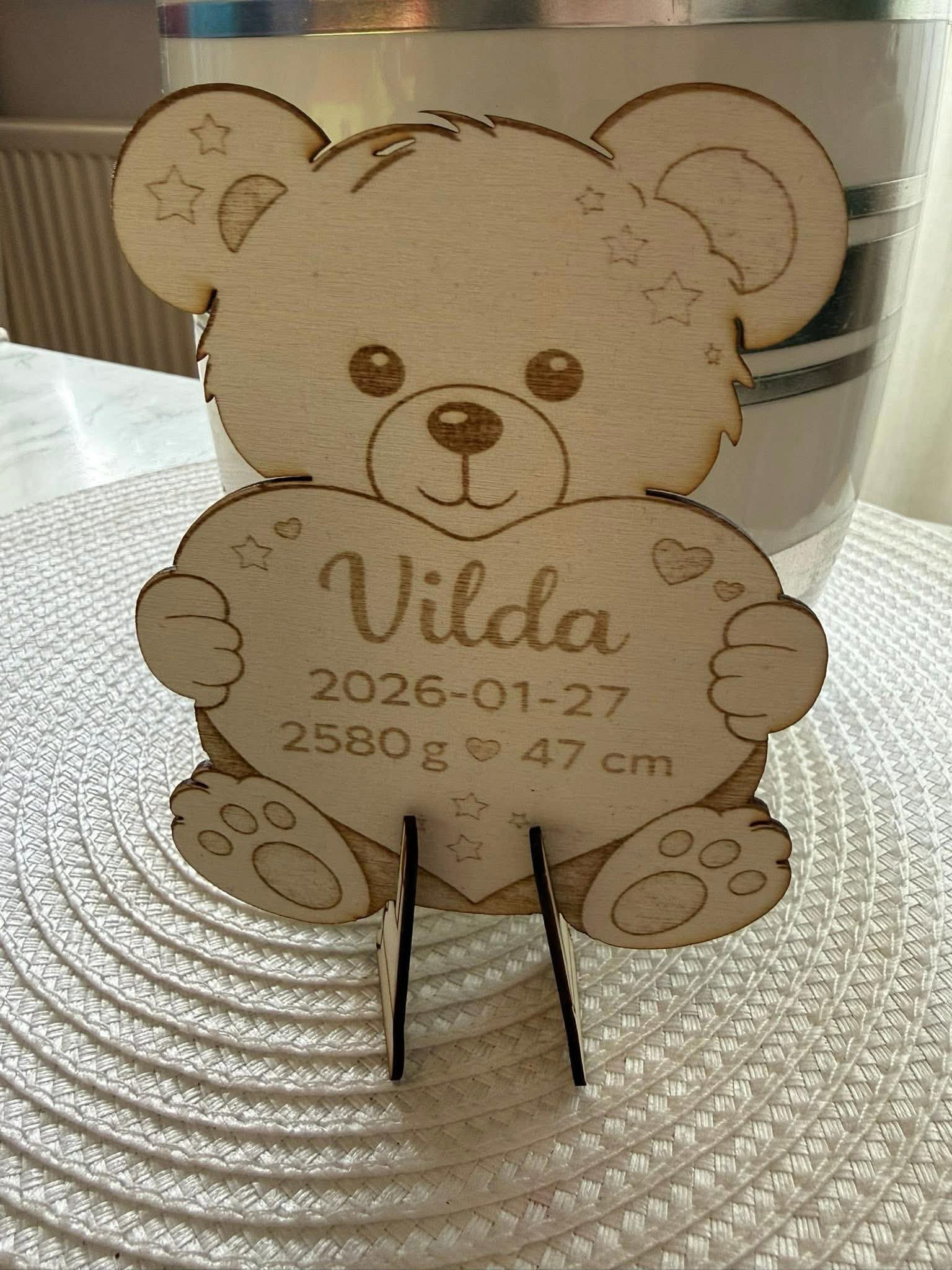 Denna söta tavla i trä graveras med barnets uppgifter och passar perfekt som present till dop, namngivning eller babyshower.